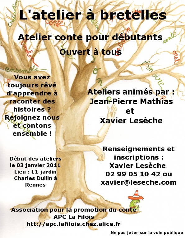 * Depuis sa création en 1993, l’APC-La Filois organise des ateliers conte. Dans la continuité de notre ligne pédagogique de transmission du patrimoine oral conté, L'APC propose cette saison 2010/2011 quatre ateliers de pratique artistique conte :